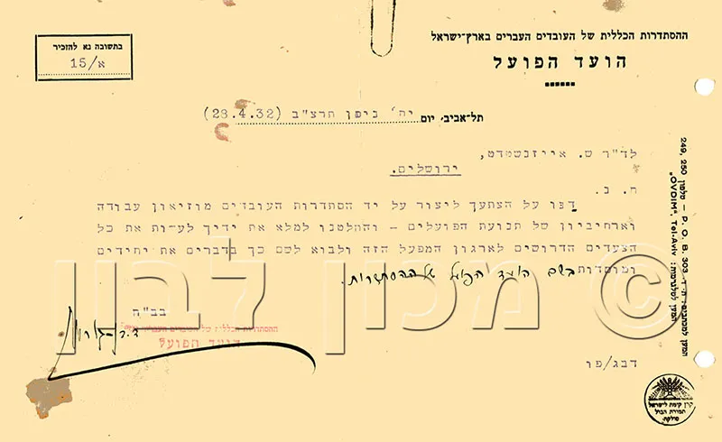 במקביל לקול הקורא, פנה פרופ'  אייזנשטאדט לדוד בן-גוריון, שהיה המזכיר הכללי של הסתדרות העובדים באותה עת, ובמכתבו הציג בפניו את חזון בית האוסף – הארכיון.